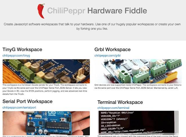今回はChiliPeppr Grbl Workspaceを試してみました。以下がサイトの入り口ですが、ここにも書いてあるように、Javascriptを使ってブラウザ上でシリアル通信を行えるような仕組みになっているようです。Grbl以外にもTinyG、そしてArduinoなどもすべてJavascript化してしまう感じです。
